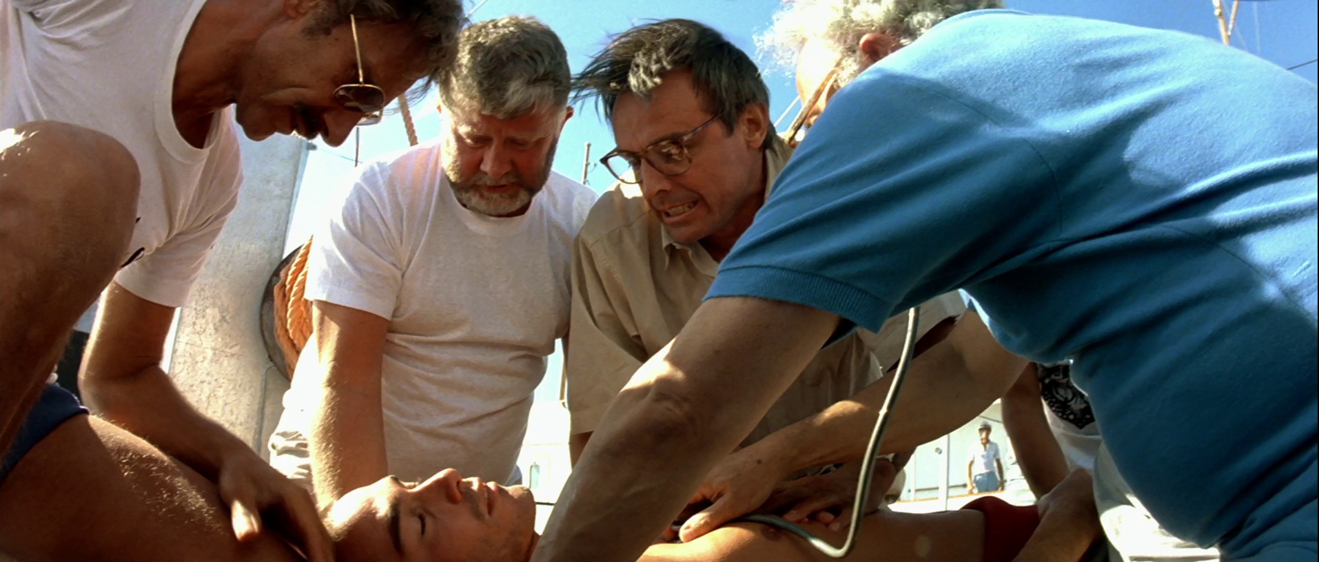 意外发生了。好友恩佐在潜水中不幸丧生,杰克把恩佐的尸首放入大海当中,杰克的心中非常迷乱,他觉得自己不再属于人类社会,只想潜进深海,像海豚一样陪伴大海一生。尽管传来了乔安娜怀孕的消息,杰克深情的看了看爱人,转身投入了大海的怀抱。