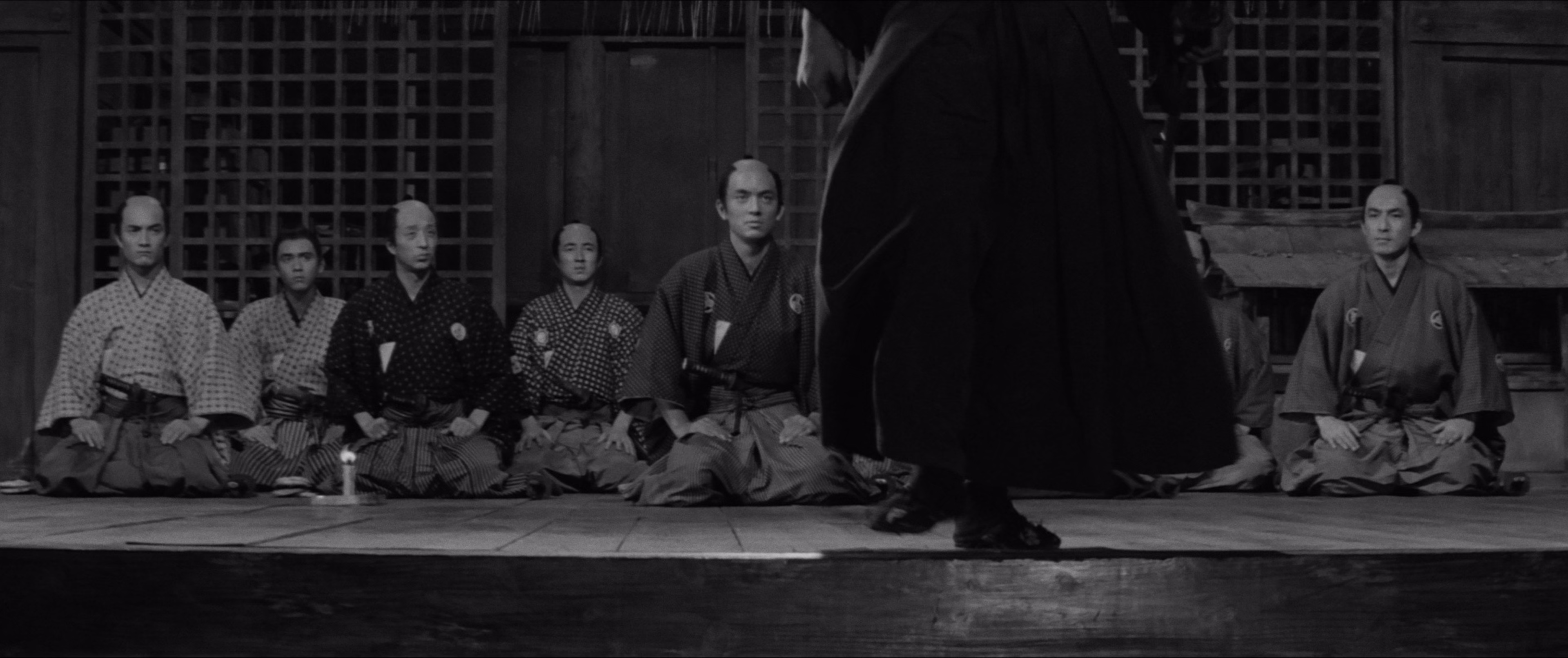 郊外神社的神殿里,九位年轻武士在秘密开会,城代家老的外甥井坂(加山雄三饰)准备向大目付菊井求助整治内部问题。但外貌邋遢的武士椿三十郎(三船敏郎饰)出现,告诉他们菊井才是背后的黑手。果然,神殿很快被大目付手下团团围住,三十郎出手替年轻人解危,而室户半兵卫(仲代达矢饰)却欣赏三十郎的身手,欢迎他加入。之后,三十郎与九人组去找城代家老,却发现晚了一步已被绑架。